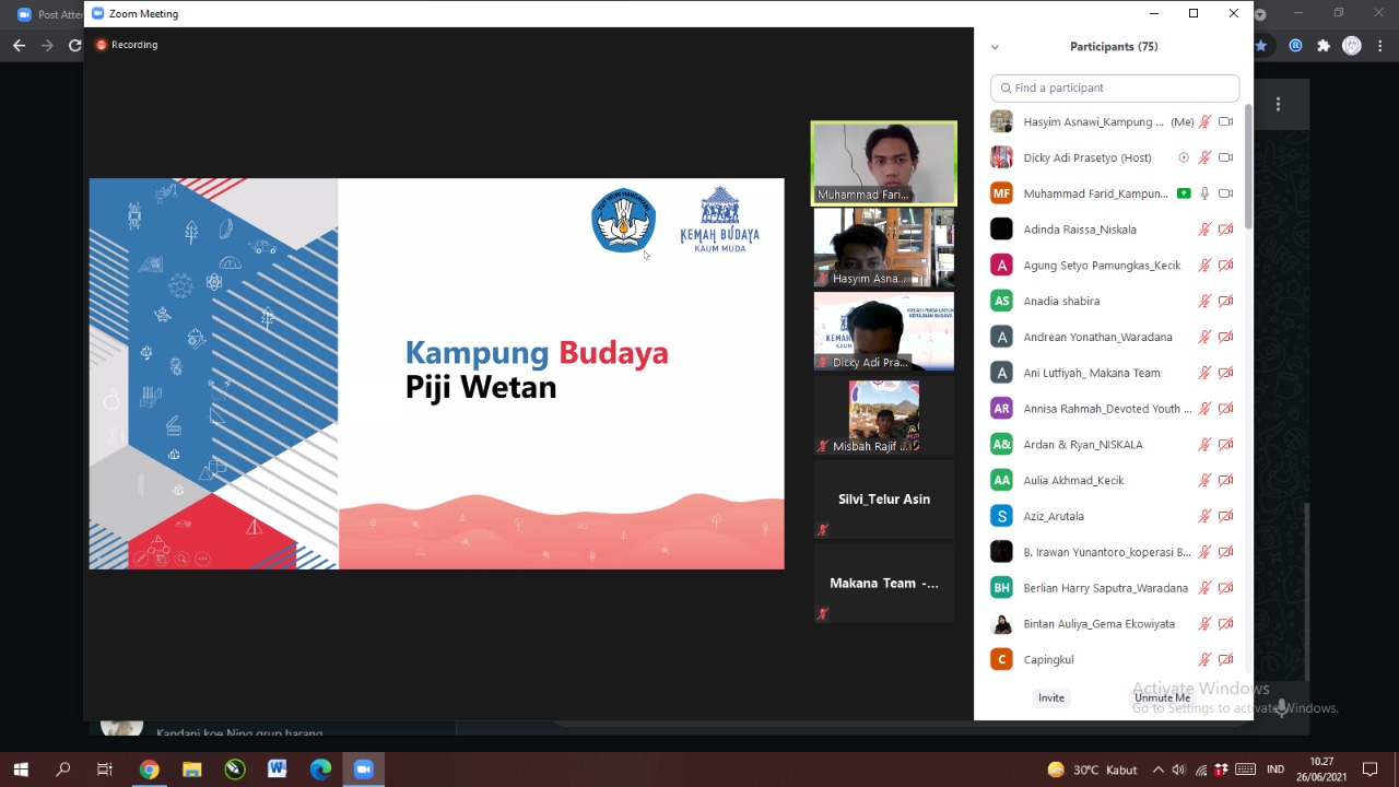 Dalam program tersebut, dua tim mewakili Kabupaten Kudus untuk mempresentasikan ide pemajuan kebudayaan di Kawasan Muria. Tim pertama yakni Kampung Budaya Piji Wetan dengan anggota Muhammad Farid, Hasyim Asnawi dan Nor Zahroh. Sedangkan tim kedua bernama KBPW Indonesia yang beranggotakan Umi Zakiyyatun Nafis, Muhammad Rifqi Bakhtiar dan Tsania Laila Maghfiroh.