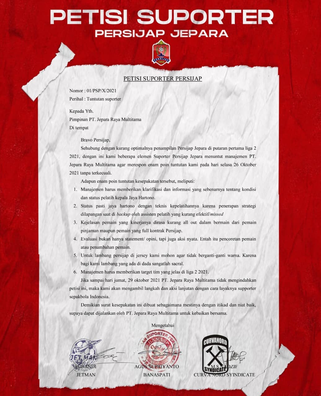 Persijap Jepara kompak melayangkan petisi kepada manajemen dalam hal ini PT