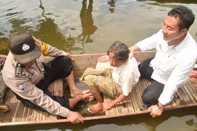 menggunakan perahu. Satu warga yang sudah tua harus dirujuk ke RS Mitra Bangsa