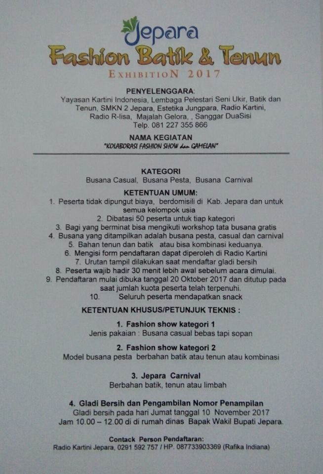 Silahkan yang mau ikut dalam even kreatif yamg akan digelar 11 November ini. Even ini diperuntukkan bagi para perancang dan peraga busana Jepara untuk mengembangkan kreatifitasnya. Gratis tetapi kuota terbatas. Segera mendaftar di Radio Kartini FM Jepara. Terima kasih.