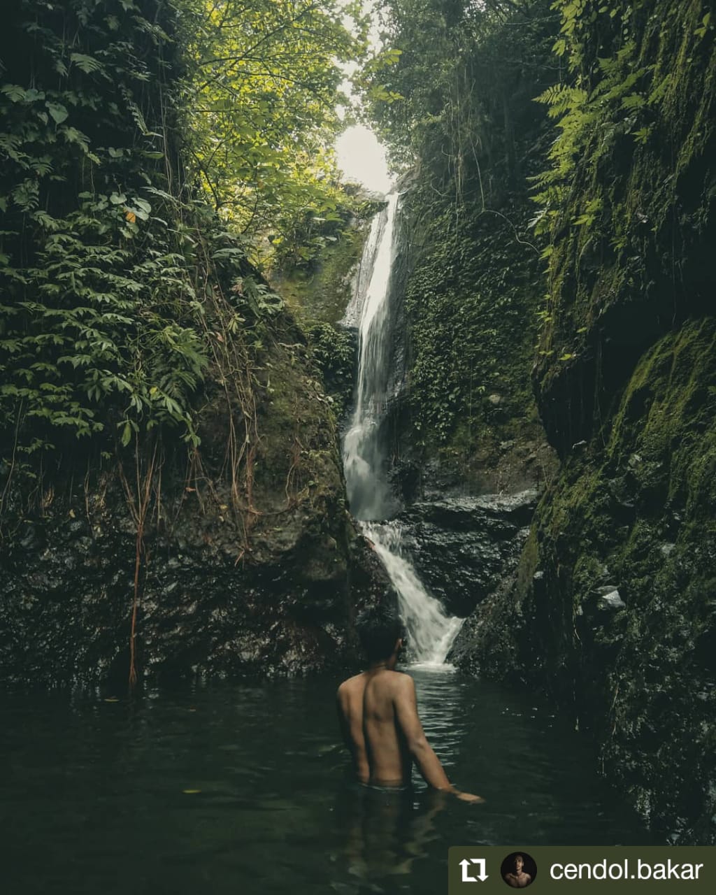 Deni mengaku suka sekali dengan kolam yang pertama ini, karena bisa lompat dari tebing samping air terjun yang menambah keseruan explore air terjun ini.