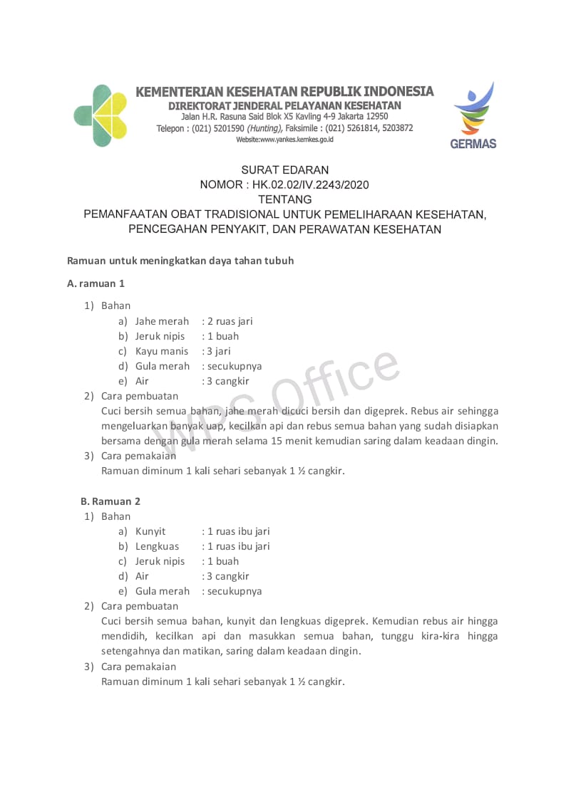 HK.02.02/IV.2243/2020, tentang pemanfaatan obat tradisional untuk pemeliharaan