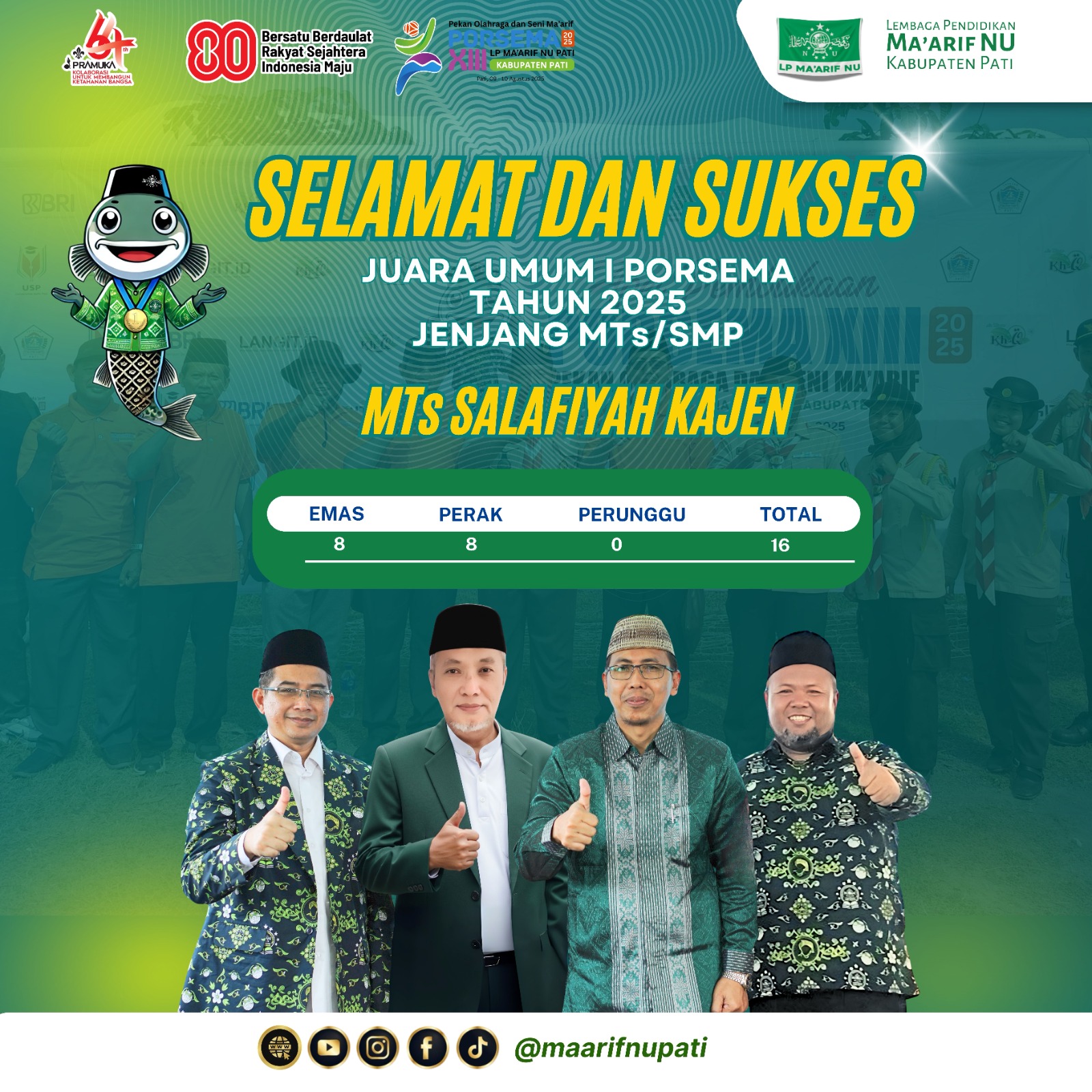MTs. Salafiyah Kajen berhasil dinobatkan sebagai juara umum dengan total 8 emas dan 8 perak, diraih dari 29 cabang lomba yang berbeda, yaitu 12 lomba di bidang olahraga dan 17 di bidang seni.