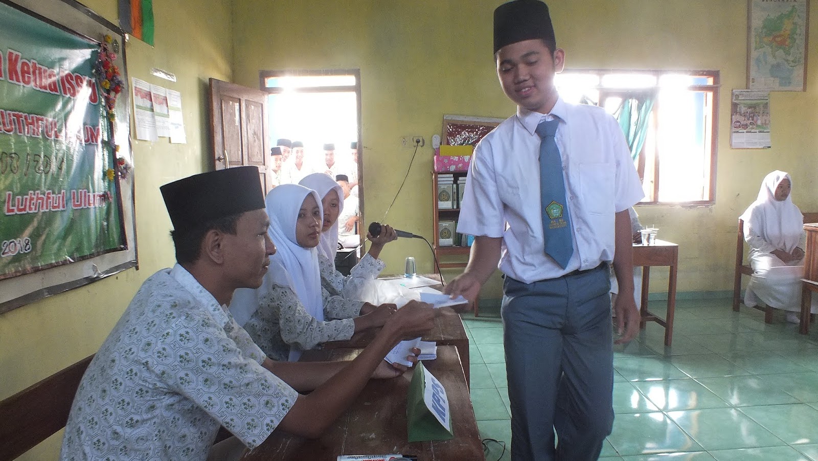 Seorang siswa yang akan memberikan hak suaranya dalam pemilihan umum ketua Ikatan Siswa Luthful Ulum (ISLU) MA NU Luthful Ulum Dukuh Wonokerto, Desa Pasucen, Kecamatan Trangkil |