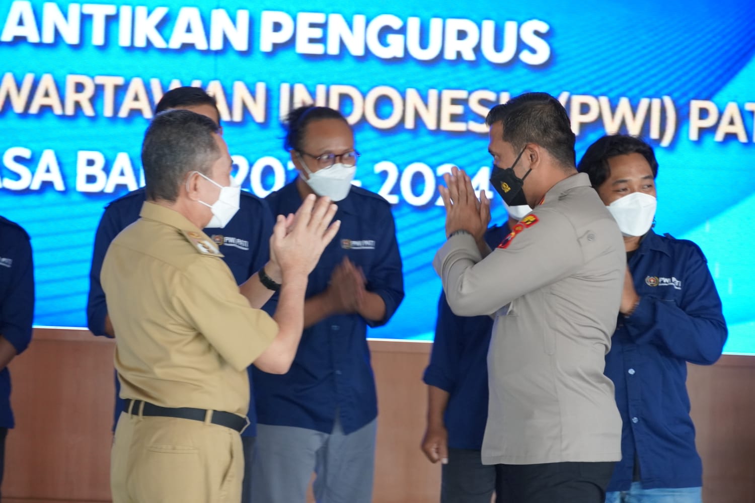 | Bupati Haryanto dan Kapolres Pati memberikan ucapan selamat kepada pengurus PWI Pati usai dilantik Selasa (30/11/2021) |