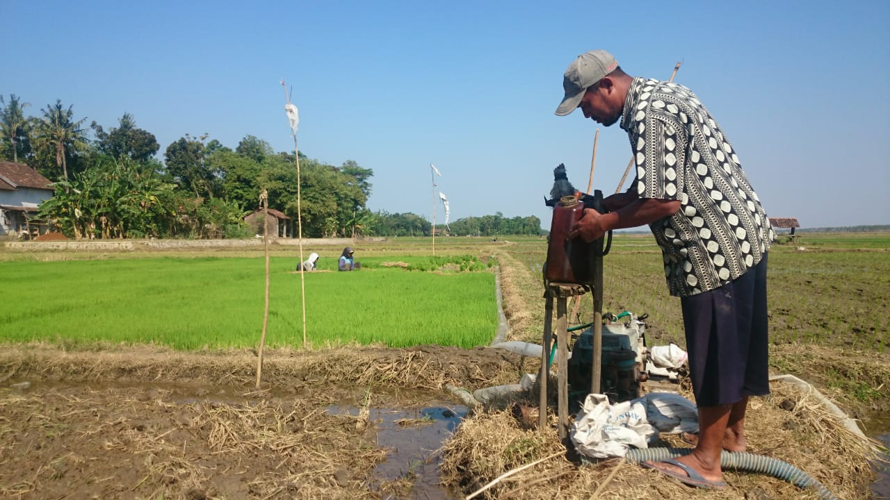 | Petani di Kecamatan Dukuhseti sedang mengisi solar ke mesin diesel pompa airnya |