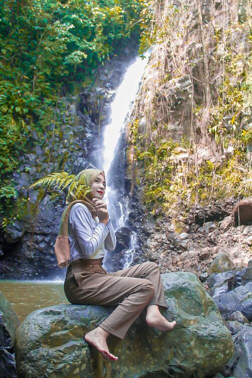| Mila berpose di atas batu besar di air terjun Dong Paso Somosari, Jepara |