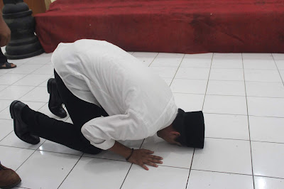 yang berpakaian hem putih lengan panjang dan songkok hitam langsung bersujud