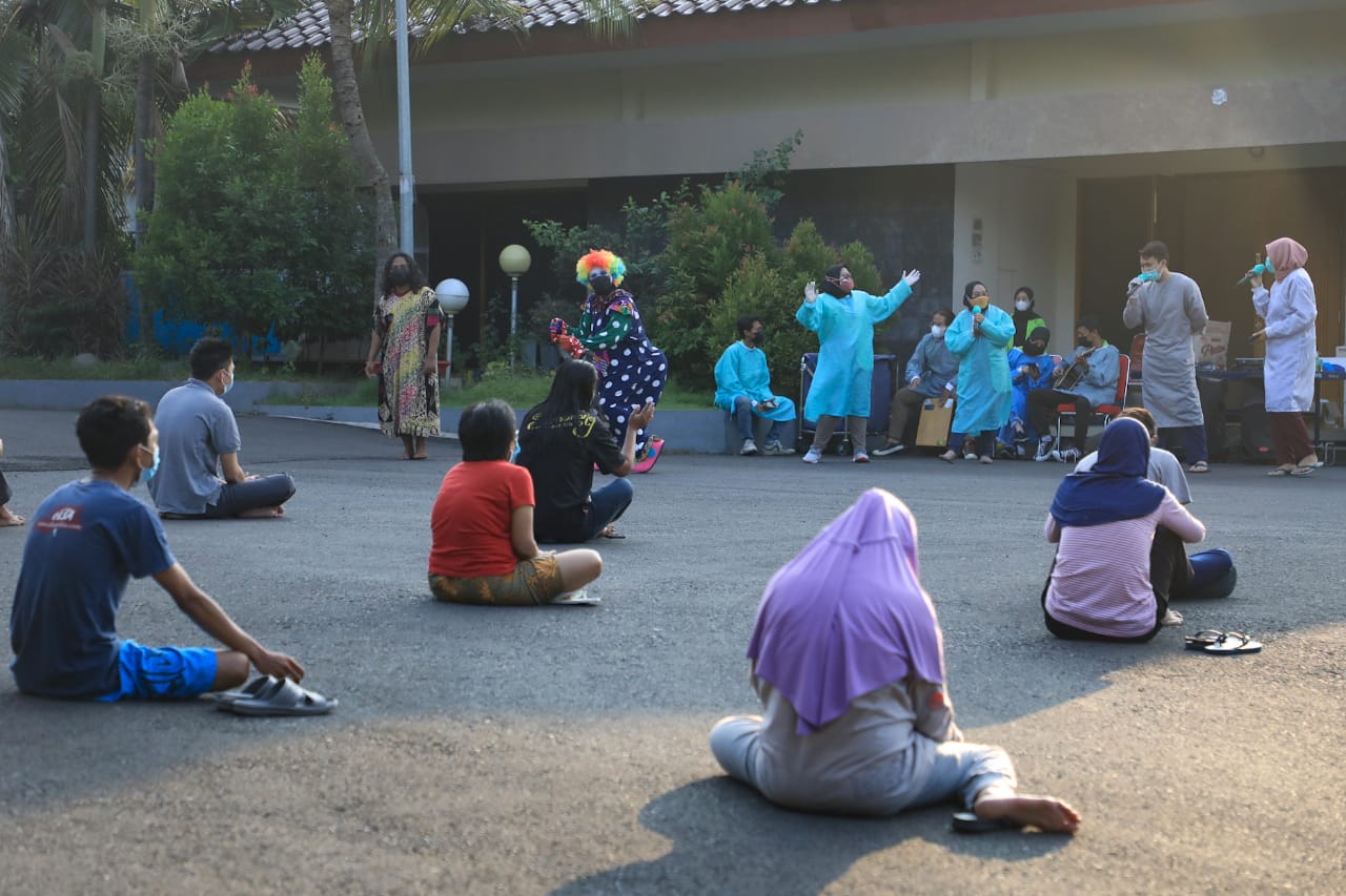 | Aksi badut yang diperankan mahasiswa UIN Walisongo menghibur para peserta isolasi terpusat di rumah dinas Walikota Semarang. |